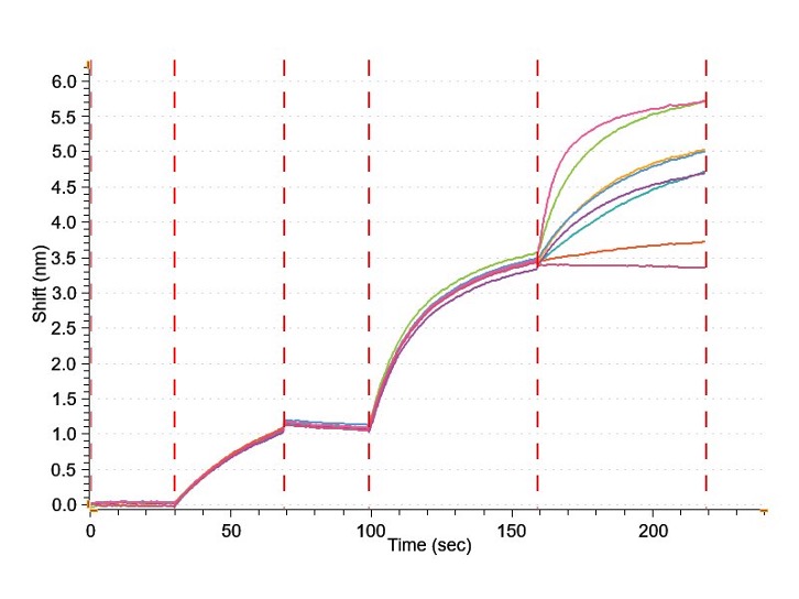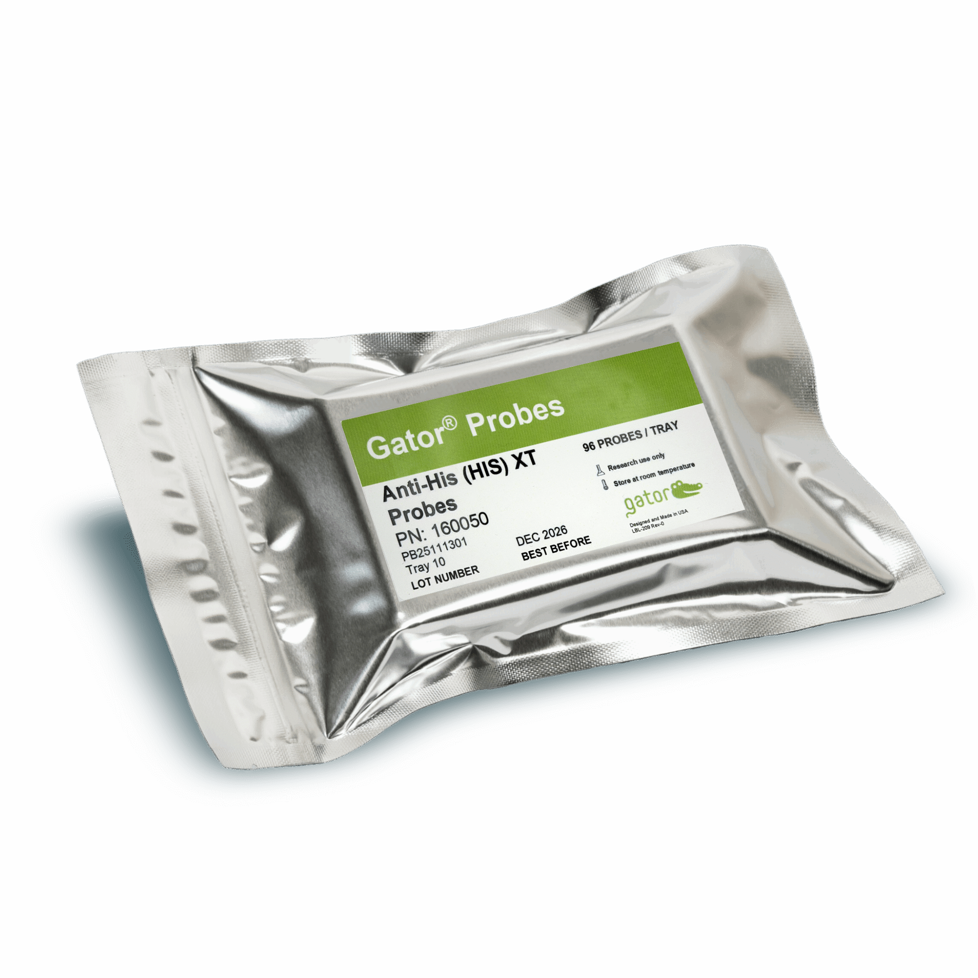 Anti-His (HIS) XT Probes HIS XT Biosensors for His-Tagged Protein Analysis Product Number: 160050 Product Description: A tray of 96 Gator Anti-His (HIS) XT Probes coated with an Anti-His NovoBody(TM) for high-performance His-tagged protein capture, for use in Q/K/QKR/EP assays Buy now Advancing antibody discovery Industry’s First AI-Designed Anti-His Probes Deliver Superior Performance for His-Tagged Protein Analysis Gator® HIS XT Probes achieve exceptional His-tag binding affinity with industry-leading baseline stability and 4x higher signal resolution—powered by AI-engineered NovoBody™ technology from Monod Bio. Experience breakthrough performance for His-tagged protein characterization with the first biolayer interferometry probes to incorporate computationally designed binding proteins. HIS XT Probes deliver superior capture strength, extended probe lifetime, and precise real-time data for quantitation, kinetic analysis, and epitope binning applications. Download Flyer AI-Designed Technology. Superior Results. Unlike traditional anti-His probes coated with mouse monoclonal antibodies, HIS XT Probes feature Monod Bio’s AI-designed NovoBody™ binding proteins engineered for: Elimination of Fc interference for advanced applications Superior affinity to His-tagged proteins Industry-leading baseline stability (58% reduction in drift) 4x higher signal resolution for weak interactions Extended probe lifetime with robust regeneration Learn more about NovoBody Binders HIS XT Anti-His Previous Next Superior Baseline Stability Minimizes Drift for High-Resolution Kinetic Analysis of His-Tagged Targets The Gator HIS XT Probe delivers high‑resolution kinetic analysis of His‑tagged targets by providing superior baseline stability, which is essential for accurate kinetic studies and minimizes data artifacts from drift. Its exceptional low baseline drift and high loading capacity produce cleaner sensorgrams with better fit quality, enabling precise determination of association/dissociation rates even for slow off‑rates. Lower loading levels further reduce avidity effects compared to traditional His probes, while HIS XT ‘s optimized design improves overall data quality for protein–protein, protein–antibody, and protein–peptide interactions. Buy now High-Sensitivity, Stable Capture for Fast, Robust Kinetic Characterization of His-Tagged Proteins HIS XT Probes are suited for robust kinetic analysis due to their high ligand loading capacity and exceptionally stable baseline performance. The NovoBody-based capture surface exhibits equal sensitivity toward both N-terminal and C-terminal His tags with far faster binding rates for faster assays. In most cases, ~1–5 µg/mL His-tagged protein is sufficient to load the ligand onto the sensor and perform kinetic characterization with its binding partners. When performing regeneration, the captured His-tagged protein will be removed with the analyte and will require to be re-captured prior to the analysis of the next analyte sample. Download Application Note Representative kinetics (K) assay sensorgram showing capture of His-tagged CD64 on the His XT probe, followed by association and dissociation of human IgG1. “We are pretty impressed. These new HIS XT probes effectively eliminate Fc-mediated interactions and can be reliably used to assess direct binding or in other experiments with Fc interacting partners with confidence. We are very interested in working this product into our workflow.” Zachary A. Bornholdt, Ph. D. CEO, Eitr Biologics, Inc. “We evaluated Gator’s new HIS XT probes in an epitope binning study and observed excellent performance. The probes showed ideal capture behavior, high-quality kinetic traces, and robust regeneration. The resulting data was clean and straightforward to interpret, enabling rapid, actionable insights.” Allison Nixon, Ph. D. Head of Platform Sciences, Ability Biotherapeutics “The HIS XT probes gave less error, and results were closer to the published dissociation constant. They also load ~2x as much of the same protein prep in half the time as traditional anti-His probes. Overall, the signal is much cleaner/more stable. Also, it’s cool to watch these capture his-tagged nanobodies out of supernatant from our neoSwitch strain!” David Ichikawa Scientist III, Neochromosome, Inc. Previous Next His-HSA standard curve using 2-fold dilution series from 1000 µg/mL to 0.24 µg/mL and measured using the Gator® HIS XT probe with a 120 sec acquisition at 400 rpm. Versatile One-Step and Two-Step Quantitation for His-Tagged Analytes and Capture Proteins HIS XT Probes support both one-step and two-step quantitation workflows. In one-step quantitation, His-tagged analyte in unknown samples binds directly to the HIS XT probe and is quantified against a standard curve. In two-step quantitation, a His-tagged capture protein is first loaded onto the probe, followed by measurement of analyte binding to the captured protein. Both methods can be analyzed using endpoint or rate-based probe response to concentration. Robust Regeneration Supports High-Throughput Tandem Epitope Binning The HIS XT probes high loading capacity, stable baseline, and regeneration robustness make it ideal for tandem epitope binning workflows. In tandem binning, the His-tagged antigen is captured on HIS XT probes, followed by sequential exposure to two antibodies. If the secondary antibody can bind, the two antibodies do not compete (not in the same epitope bin); if there’s no binding, they compete (same epitope bin). Complete characterization of 256 antibody pairs can be performed in under 4 hours using the Gator Plus system. Representative sensorgram of a tandem epitope binning experiment Human IgG1-CD64-his Fc Receptor binding to human IgG4- CD32A-H167-his Previous Next Enhance Fc Receptor Binding Assays with Cleaner Baselines and Superior Capture HIS XT probes do not contain any antibody Fc, enabling accurate, high-quality Fc-r